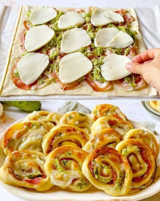 Den Teig ausrollen, leicht mit Frischkäse bestreichen und mit Pizzagewürz bestreuen. Dann mit Schinken, Zucchini und Zwiebeln belegen. Den Teig von der Längsseite her aufrollen, mit einem Messer in 2 cm dicke Scheiben schneiden und auf ein mit Backpapier ausgelegtes Backblech legen.