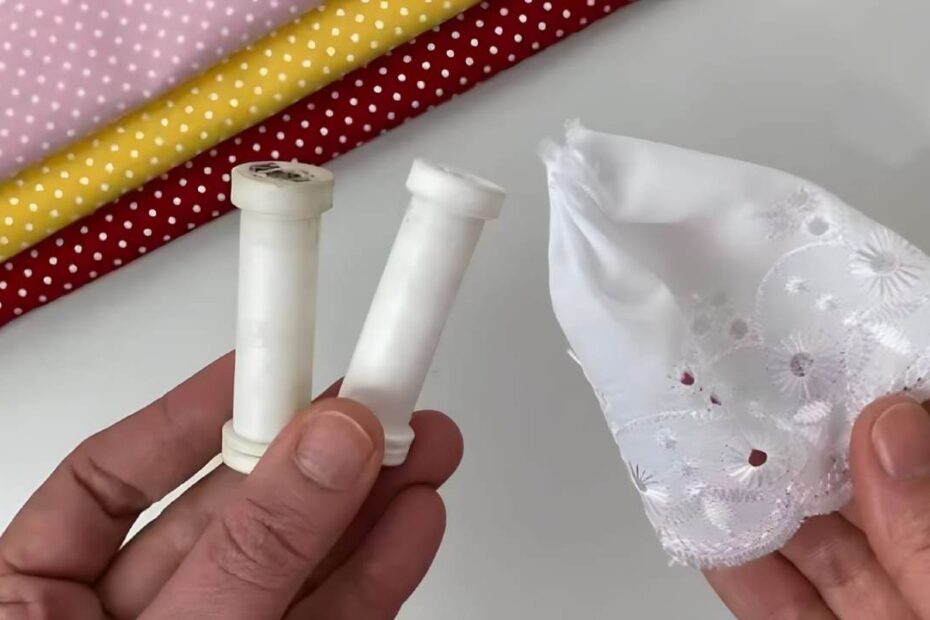 Mit Heißkleber befestigen wir den Filz oben und unten am Plastikstück, um es vollständig zu umwickeln. Anschließend kleben wir den Filz auf das bereits geklebte Teil. Anschließend nehmen wir zwei Stoffstücke: eines mit den Maßen 25×6 cm und das andere mit den Maßen 35×3 cm, mit denen wir den Rock der Puppe nachbilden. Die beiden Teile werden schließlich zusammengenäht.
