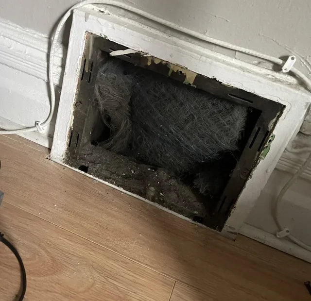 - Das sieht schlimm aus, aber ich würde einen Heizungs-, Lüftungs- und Klimatechnikprofi beauftragen, anstatt mich damit auseinanderzusetzen. Wenn es sich nicht um Asbest handelt, sollte es wahrscheinlich gereinigt werden.